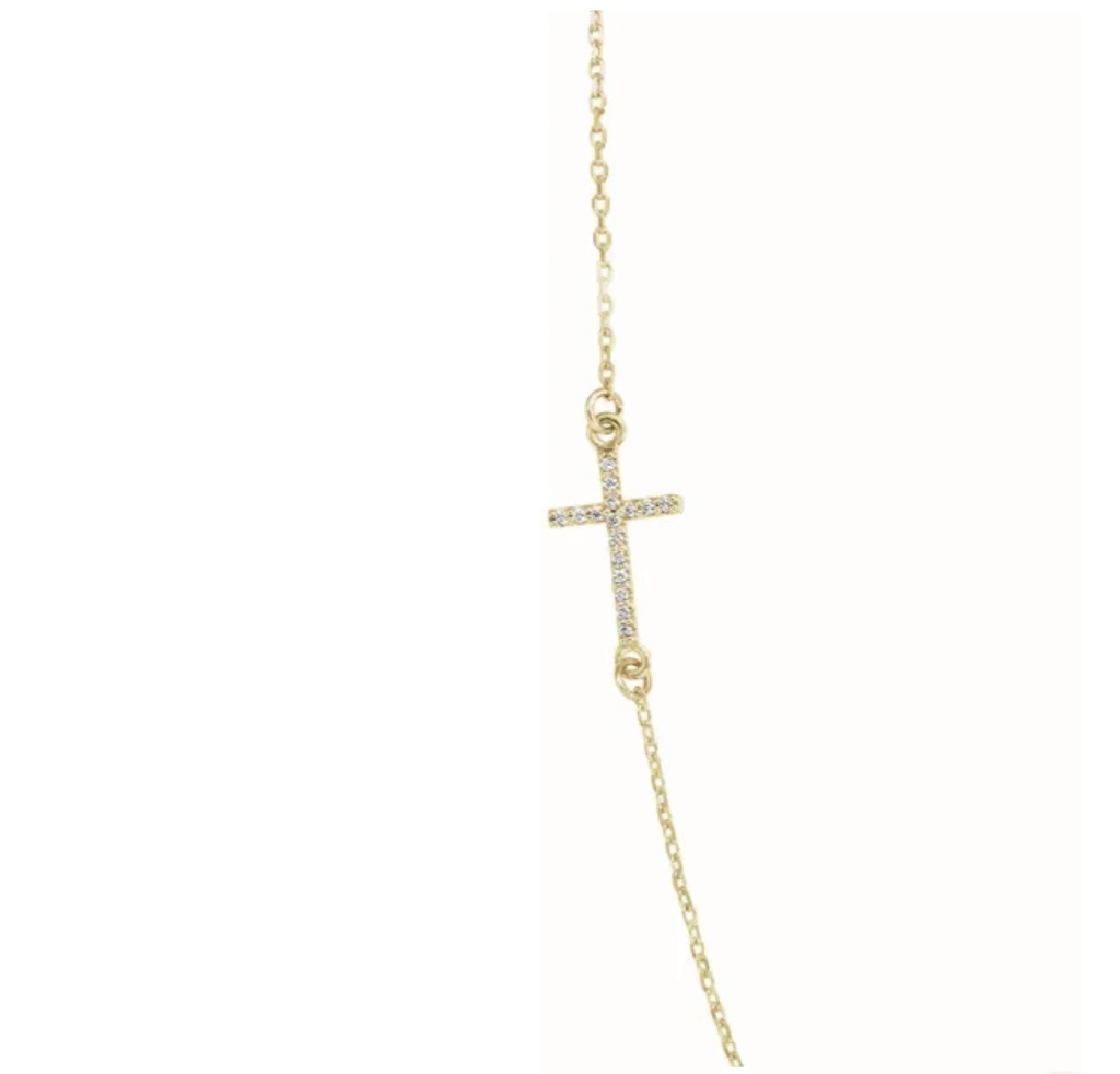 This 14K yellow gold necklace features a delicately off-center sideways cross adorned with natural diamonds (0.04 ctw). The cross pendant (14.8 x 7…