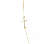 This 14K yellow gold necklace features a delicately off-center sideways cross adorned with natural diamonds (0.04 ctw). The cross pendant (14.8 x 7.5 mm) is set with precision using four standard prongs, each holding a shimmering 0.9 mm diamond to enhance its brilliance.